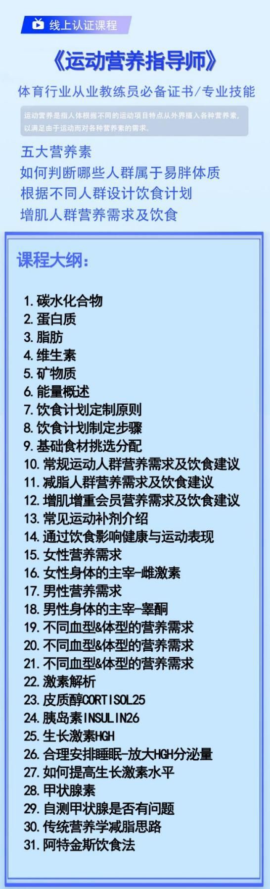 體育職業(yè)人才網(wǎng)《運動營養(yǎng)指導(dǎo)師》全能認證課程體系全新升級!