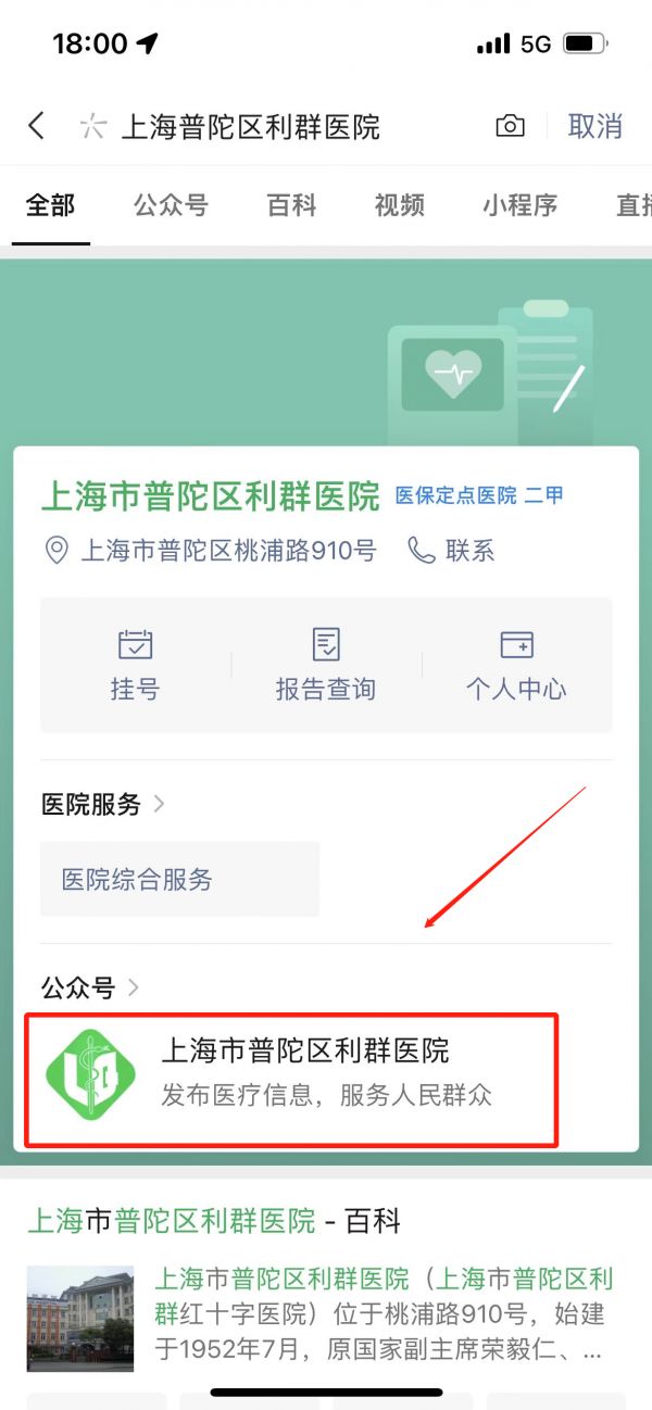第一步:微信搜索“上海市普陀區(qū)利群醫(yī)院”公眾號(hào),然后點(diǎn)擊進(jìn)入;