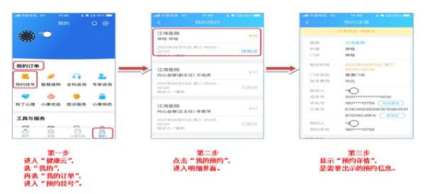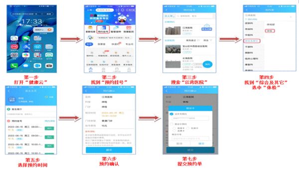 1、提前預(yù)約:所有體檢均需在健康云APP上提前預(yù)約體檢時(shí)間(每周五會(huì)發(fā)放預(yù)約號(hào),無需掛號(hào)及付掛號(hào)費(fèi))。健康云預(yù)約流程,如圖: