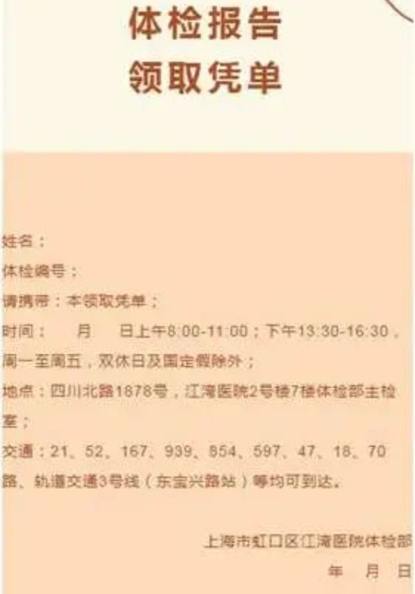 (1)體檢報(bào)告領(lǐng)?。喝肼汅w檢于2個(gè)工作日后領(lǐng)取,普通體檢于7個(gè)工作日后領(lǐng)取,如果有特殊項(xiàng)目會(huì)告知體檢者。請(qǐng)攜帶健康體檢報(bào)告領(lǐng)取憑單,至體檢中心主檢室領(lǐng)取。