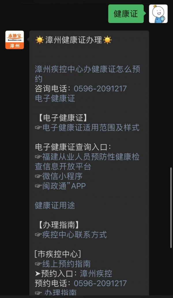 溫馨提示:微信搜索公眾號(hào)【漳州本地寶】,關(guān)注后在對(duì)話框發(fā)送【健康證】可獲漳州電子健康證查詢?nèi)肟?、漳州辦理指南、線上預(yù)約入口,領(lǐng)取時(shí)間等內(nèi)容。