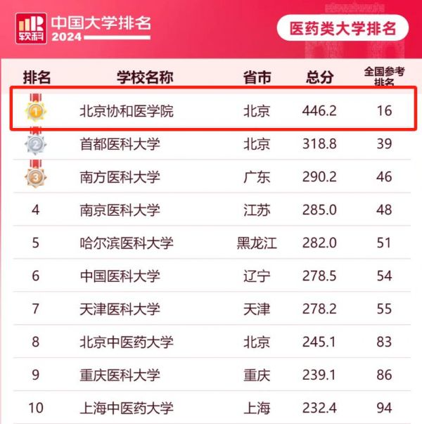 談到實(shí)力,我們先以最直觀的排名來看,在軟科中國醫(yī)藥類大學(xué)排名中,北京協(xié)和醫(yī)學(xué)院可謂是連續(xù)多年都“霸榜”第一的位置。如果覺得僅僅這一個(gè)排名還不夠有說服力的話,最新發(fā)布的2024校友會中國醫(yī)藥類大學(xué)一流專業(yè)(研究型)排名中,北京協(xié)和醫(yī)學(xué)院仍然牢牢占據(jù)首位。