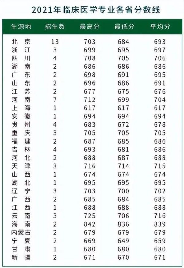 有同學(xué)可能想問:那它這么強(qiáng),難考么?答案自然是肯定的,甚至可以說“考得上清北,但不一定考得上協(xié)和”。從官方公布的2021年各省分?jǐn)?shù)線來看,除去一些省份高考總分不是750以外,大部分省份臨床醫(yī)學(xué)專業(yè)的分?jǐn)?shù)線都超過了680分,像四川、天津等部分省份甚至直接錄取最低分突破700,其競爭強(qiáng)度稱得上“千軍萬馬過獨(dú)木橋”。