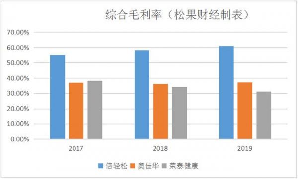 報告期內(nèi),倍輕松綜合毛利率分別為55.29%、58.19%、60.93%,逐年增高。而行業(yè)龍頭奧佳華過去三年的毛利率則為37.00%、36.26%、37.22%,上市公司榮泰健康過去三年的毛利率則為38.22%、34.07%、31.28%。