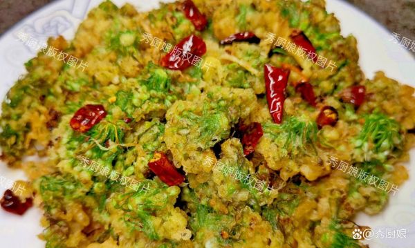2. 裹蛋液:將瀝干水分的韭菜花段逐個放入蛋液中,確保每一根韭菜花都均勻地蘸上蛋液。這樣可以使炸出來的韭菜花更為酥脆,并且顏色金黃誘人。