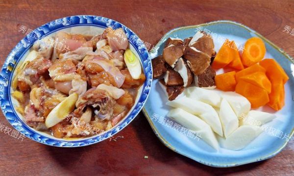 1. 山藥去皮,切成滾刀塊;胡蘿卜去皮,切塊;香菇泡發(fā)后去蒂,切片;雞腿洗凈,剁成塊,用料酒、鹽、生抽、老抽腌制20分鐘;大蒜、姜切末,大蔥切蔥花,香菜切小段。