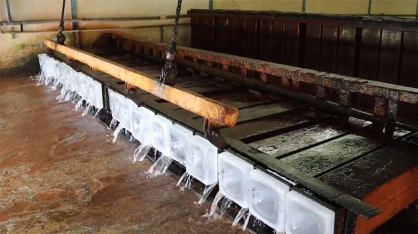 加完水后的模具會(huì)被吊裝到冷凝車間,冷凝車間里有速凍裝置,這個(gè)裝置可以將溫度快速降至-10℃。模具需要在這個(gè)車間里待上8個(gè)小時(shí),8個(gè)小時(shí)過后模具里面的水就會(huì)變成冰塊了。不過這個(gè)時(shí)候還不能取出冰塊,因?yàn)樗Y(jié)冰后體積會(huì)膨脹,冰塊牢牢地卡死在模具里,這個(gè)時(shí)候是脫不了模的,還需要進(jìn)行下一道工序。
