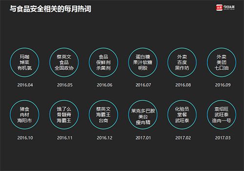 所以,在2016-2017國(guó)人食品安全關(guān)注度大數(shù)據(jù)的“與食品安全相關(guān)的每月熱詞”中,與外賣(mài)相關(guān)的平臺(tái)連續(xù)三個(gè)月上榜,黑作坊等報(bào)道引人關(guān)注。與此同時(shí),在與食品安全相關(guān)度最高的50個(gè)熱詞中,“外賣(mài)”也位居前列。