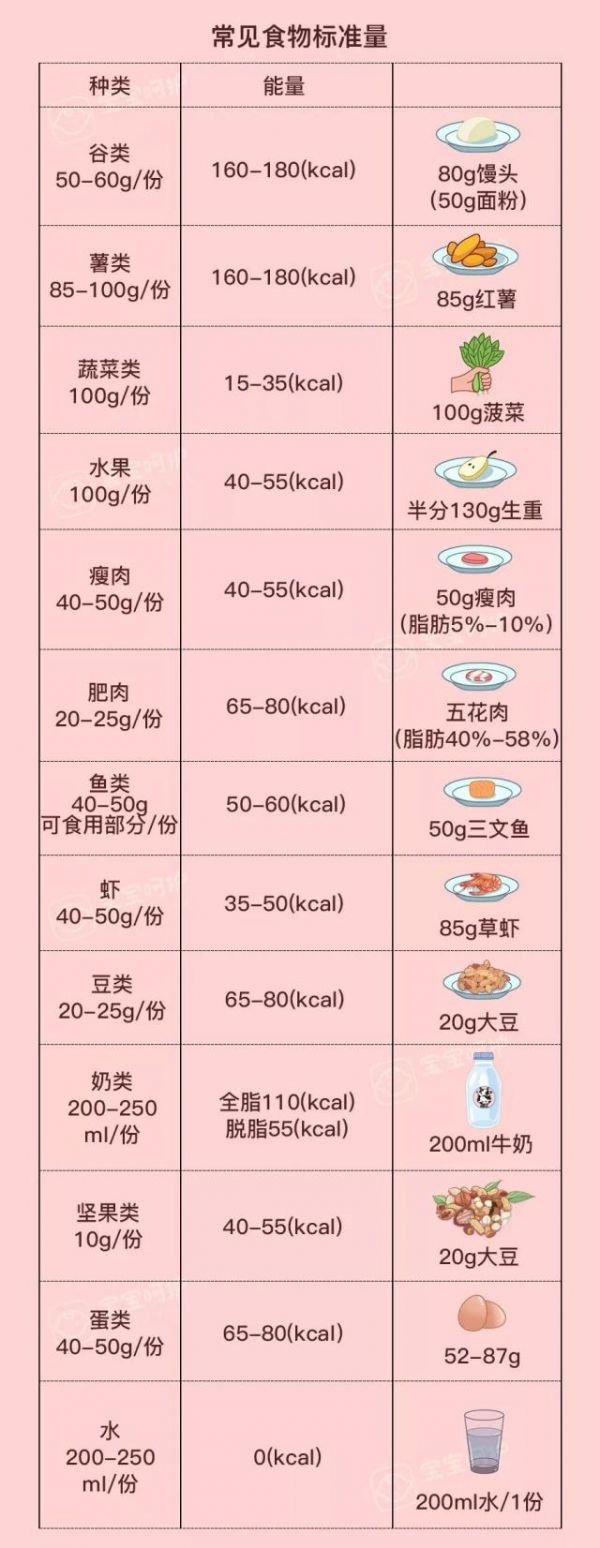 具體食物對(duì)應(yīng)的熱量值,大家可以根據(jù)它們的熱量值,選擇合適的量:
