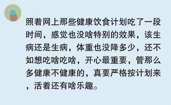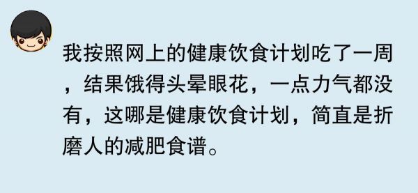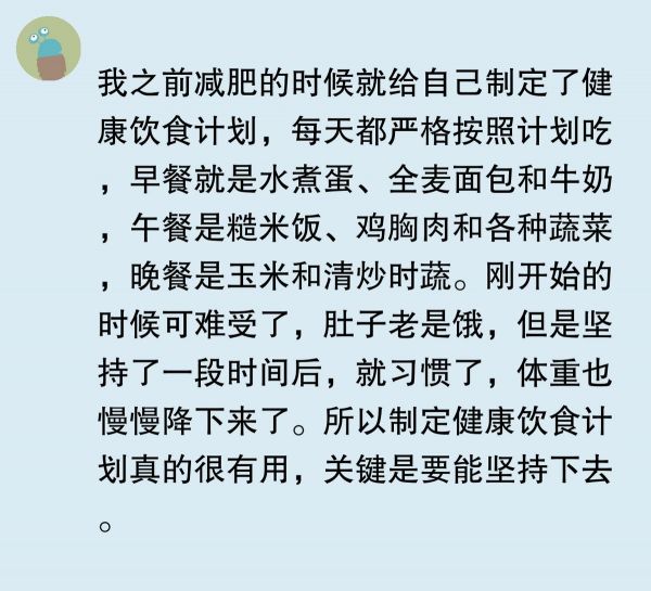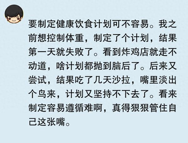 之前我想減肥,就給自己制定了個(gè)健康飲食計(jì)劃,每天各種蔬菜、雞胸肉吃著,結(jié)果沒(méi)堅(jiān)持幾天就不行了。太難做到頓頓都那么規(guī)律健康飲食了,不是沒(méi)時(shí)間做,就是有時(shí)候?qū)嵲陴捘切└邿崃康氖澄?。真佩服那些能?chē)?yán)格遵循健康飲食計(jì)劃的人,感覺(jué)他們好有毅力。