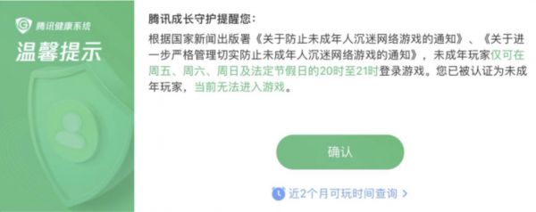 結(jié)果,卻跳出來一個綠白色的彈窗:根據(jù)國家新聞出版署相關(guān)通知,未成年玩家僅可在周五、周六、周日及法定節(jié)假日的20時至21時登錄游戲。您已被認(rèn)證為未成年玩家,當(dāng)前無法進入游戲。