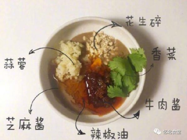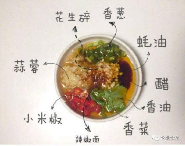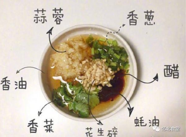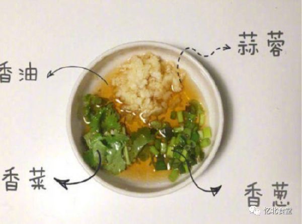 蒜泥、香菜、香油、香蔥、耗油搭配而成,多放蒜,主要突出蒜味。