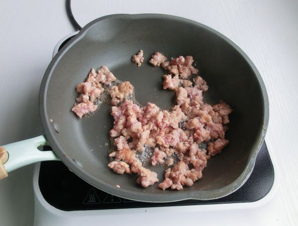 3.鍋中放入橄欖油,放入肉末先炒變色,炒至變色后盛出備用