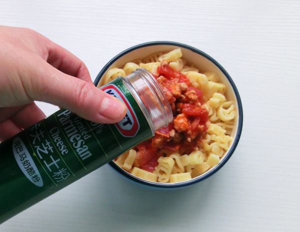 7. 澆在通心粉上,撒些乳酪粉和羅勒葉,大功告成。