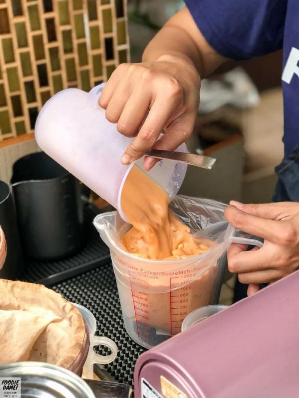 此外,“泰式風(fēng)”在產(chǎn)品包裝上也有所體現(xiàn)。與常見的奶茶店桶式包裝不同,泰式奶茶獨特地采用了預(yù)先備好的食用袋。飲用時,無需打開袋子,只需在袋子側(cè)面插入吸管,便可輕松享用,同時可拎著袋子逛街。