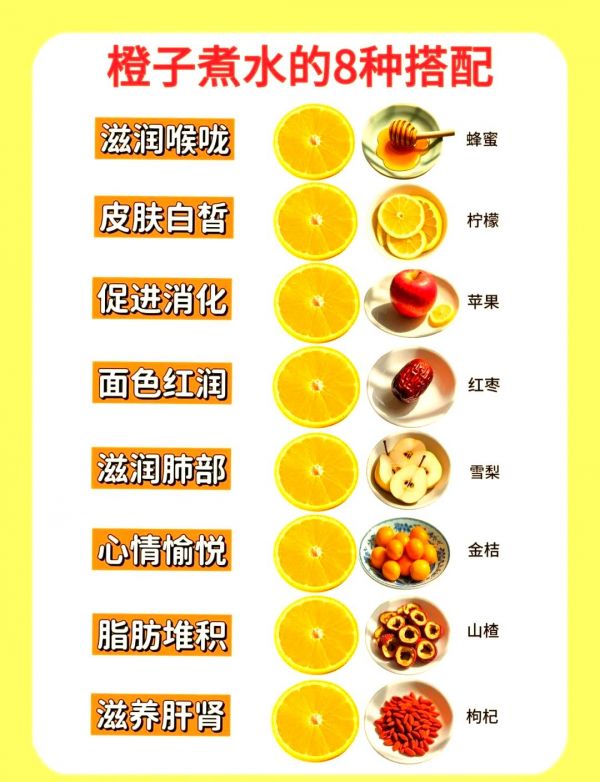 冬季養(yǎng)生好選擇:橙子煮水有8種不同搭配,每種搭配具有特定的功效,例如潤肺養(yǎng)顏、增強抗感冒、促進(jìn)腸道消化等。