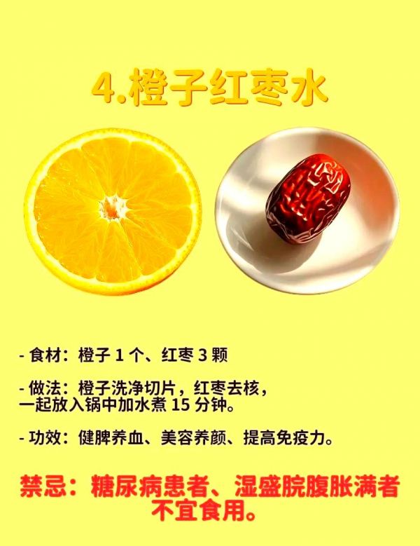 制作方法:先將橙子徹底清洗后切片,紅棗去核,隨后將這些食材一同放入鍋中,加入適量清水,煮沸后轉(zhuǎn)小火慢煮15分鐘。