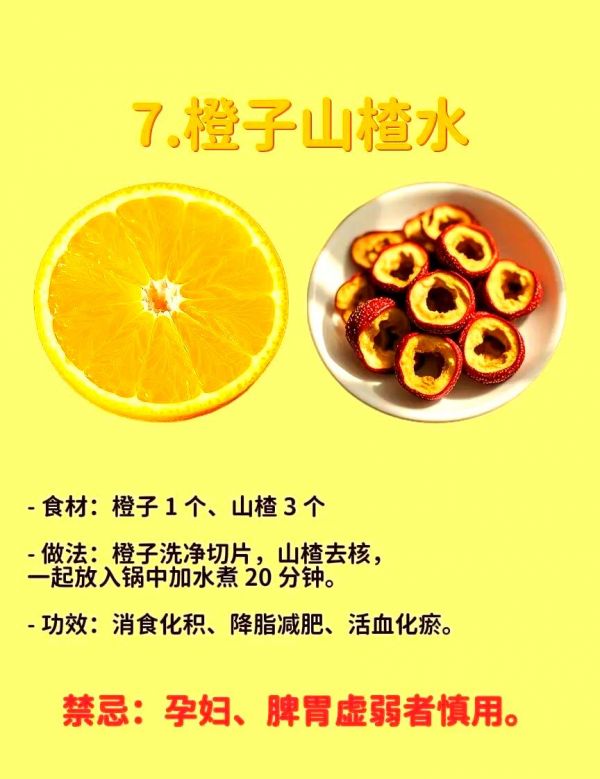 制作方法:將橙子清洗干凈后切片,山楂去核,隨后一同放入鍋中,加入適量的清水,煮沸后轉(zhuǎn)小火慢煮20分鐘。