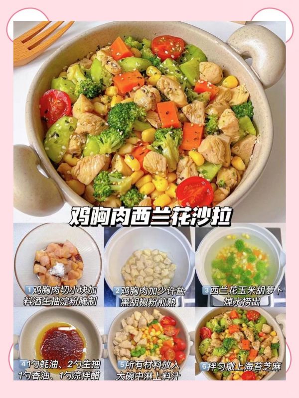 使用雞胸肉、胡蘿卜、玉米、黃瓜和西蘭花制作,搭配生抽、蠔油等調(diào)料,打造低卡高飽腹感的健康沙拉。