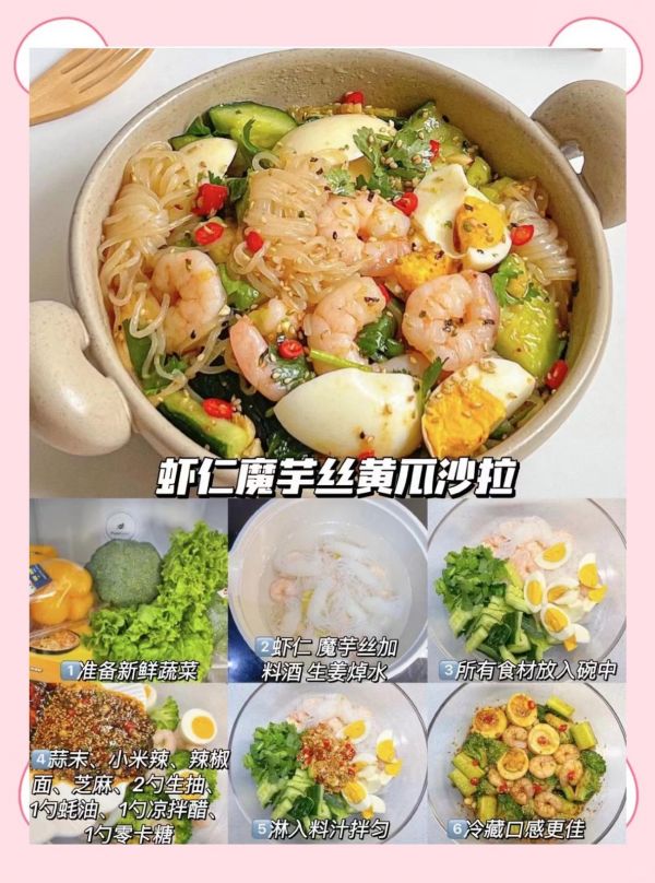 用蝦仁、魔芋絲、黃瓜及雞蛋組合,結(jié)合蒜末、香油等調(diào)料,提供清爽夏日涼菜選擇。