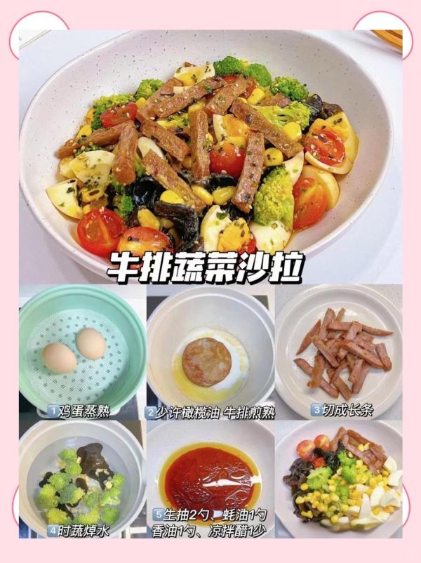 牛排和蔬菜搭配,用生抽等調(diào)料調(diào)味,是一道低卡且美味的沙拉。