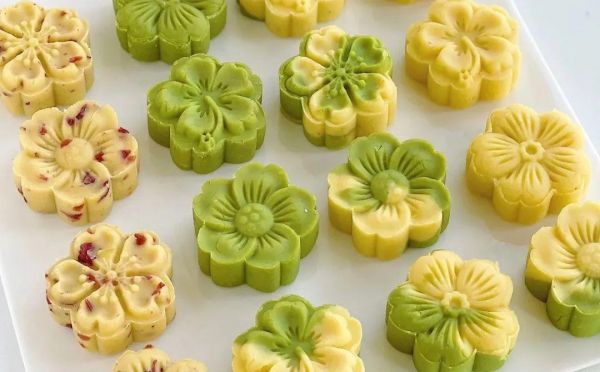 綠豆提前浸泡一晚去皮,淘洗干凈后瀝干水,放入蒸鍋蒸40分鐘;蒸熟的綠豆和牛奶倒入破壁機(jī)打成綠豆泥,盛出放入鍋中,加入黃油、白糖、煉乳、奶粉一起小火翻炒,翻炒到不沾手取出;團(tuán)成面團(tuán)分成小份份,分別加入蔓越莓干和抹茶粉揉勻,放入模具按壓出形狀即可