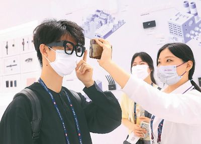 在第31屆中國(guó)國(guó)際信息通信展覽會(huì)上,觀眾體驗(yàn)AR智能眼鏡。