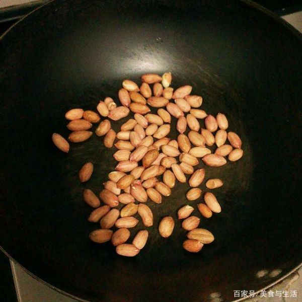 3、鍋加少許油,小火,加入花生仁炒至金黃酥脆,盛出備用。