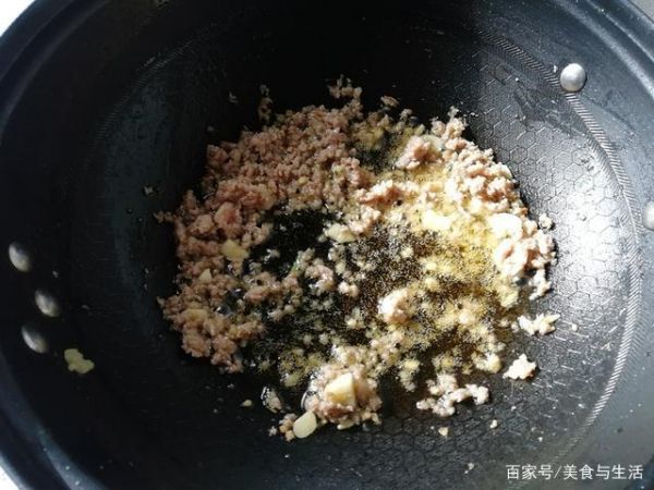 5、炒鍋倒入少許油,放姜末炒香,將肉末放入翻炒均勻變色,放少許生抽,蠔油調(diào)味。