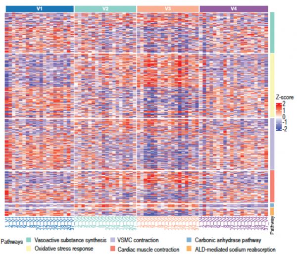 進(jìn)一步的轉(zhuǎn)錄組學(xué)分析揭示,人體暴露于高海拔缺氧環(huán)境時(shí),血流動(dòng)力學(xué)相關(guān)的多條通路呈現(xiàn)出激活(activation)與抑制(counterbalance)并存的狀態(tài)。例如,參與血管與心肌收縮和舒張的基因表達(dá)均上調(diào);同時(shí),促氧化酶與抗氧化酶的基因表達(dá)亦同步上調(diào)。這表明機(jī)體通過(guò)一種拮抗性、代償性的調(diào)節(jié)機(jī)制來(lái)驅(qū)動(dòng)對(duì)高海拔缺氧環(huán)境的適應(yīng)過(guò)程。部分基因表達(dá)的變化隨高海拔暴露時(shí)間延長(zhǎng)而更為顯著,提示生理適應(yīng)性調(diào)節(jié)逐步強(qiáng)化。當(dāng)受試者返回低海拔后,相關(guān)基因表達(dá)恢復(fù)至基線水平,與血流動(dòng)力學(xué)指標(biāo)的變化趨勢(shì)一致,體現(xiàn)了機(jī)體對(duì)短期高海拔生理應(yīng)激具有可逆的恢復(fù)能力(圖3-4)。