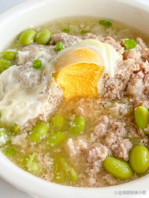 準(zhǔn)備食材: 瘦肉、毛豆、雞蛋、姜片、蔥花。