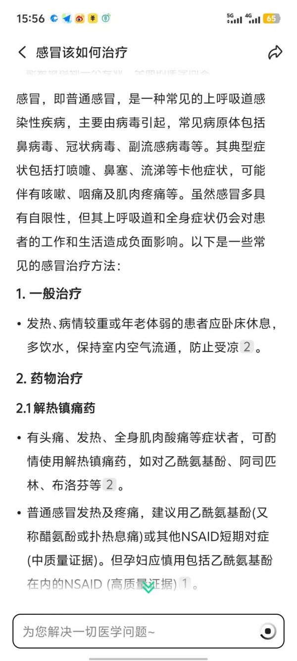 “氫原子”還具備 AI 研讀功能,可將包括外文文獻(xiàn)在內(nèi)的醫(yī)學(xué)文獻(xiàn)中的重點(diǎn)內(nèi)容總結(jié)出來,并支持翻譯、顯示原文獻(xiàn)的出處。該產(chǎn)品還支持查疾病、找藥品,可當(dāng)作醫(yī)療健康助手使用。IT之家從報(bào)道中獲悉,以“感冒該如何治療”為例,“氫原子”會從一般治療、藥物治療、中藥治療等多個(gè)維度進(jìn)行解答。