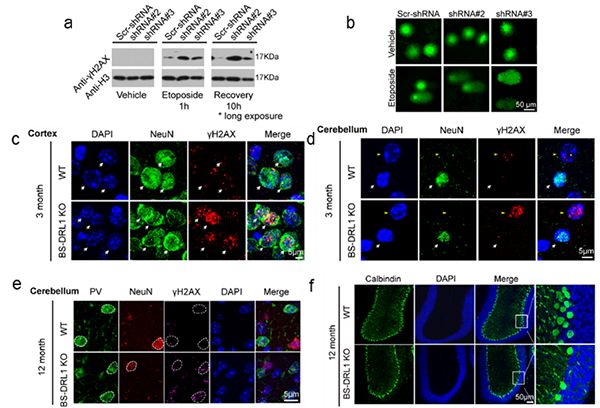 體內(nèi)體外實驗表明,BS-DRL1缺失會使原代培養(yǎng)的神經(jīng)細胞、小鼠大腦皮層及小腦中浦肯野細胞在損傷誘導(dǎo)下積累更多損傷DNA(圖a-d),且未修復(fù)的DNA損傷在生理條件下隨著小鼠年齡的增加而積累(圖e),進而造成特定神經(jīng)細胞隨著衰老漸進性死亡(圖f)。