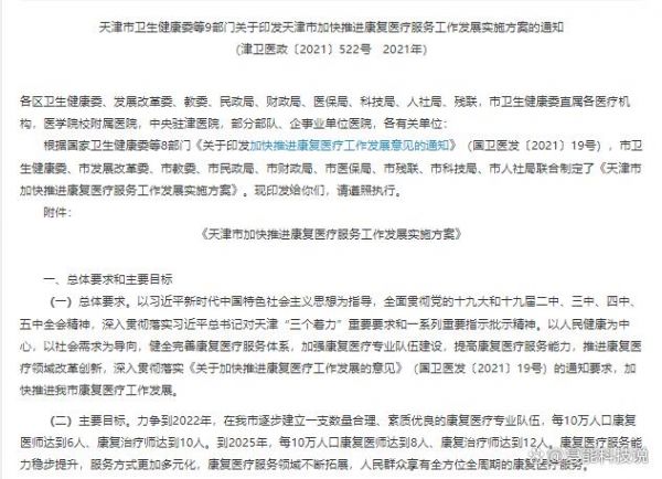 天津市近年來通過頂層設(shè)計與制度創(chuàng)新,系統(tǒng)構(gòu)建了覆蓋全人群、全生命周期的康復(fù)醫(yī)療服務(wù)網(wǎng)絡(luò)。2021年,天津市衛(wèi)生健康委聯(lián)合市發(fā)展改革委、市教委等9部門共同發(fā)布《天津市加快推進康復(fù)醫(yī)療服務(wù)工作發(fā)展實施方案》,確立了清晰的發(fā)展目標(biāo):到2025年,每10萬人口康復(fù)醫(yī)師達(dá)到8人、康復(fù)治療師達(dá)到12人,實現(xiàn)人民群眾享有全方位全周期的康復(fù)醫(yī)療服務(wù)。這一目標(biāo)直指我國康復(fù)醫(yī)療資源長期不足的痛點,為體系建設(shè)奠定了堅實基礎(chǔ)。