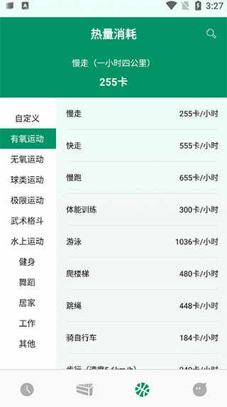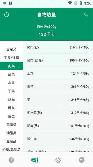 3、食物熱量,各類食物的熱量都有,用戶可參照食物熱量表搭配早餐、午餐、晚餐、零食,來達到減脂的效果。