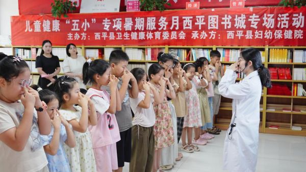 其中,西平縣衛(wèi)健體委組織縣婦幼保健院專家團隊于8月13日走進新華書店西平書城,開展兒童健康“五小”專項暑期服務(wù)月活動?;顒又?,婦幼保健院兒童保健部相關(guān)專家對現(xiàn)場幾十位小朋友開展了口腔保健、呵護眼睛、預(yù)防近視、脊柱側(cè)彎、常見異常步態(tài)等健康科普講座?;顒蝇F(xiàn)場還舉行了正確刷牙操作、 眼保健操、視覺專注力題卡比賽以及聽覺記憶題卡比賽等互動體驗小游戲。醫(yī)護人員手把手教家長和孩子學(xué)習單人徒手心肺復(fù)蘇術(shù)、海姆立克法等動作要領(lǐng),普及急救常識,讓孩子們直觀地了解和掌握急救方法。此次活動讓健康服務(wù)走出傳統(tǒng)醫(yī)療場景,融入孩子們熟悉的文化空間,既滿足了親子家庭的閱讀需求,又傳遞了實用的健康知識,為孩子們的健康成長開啟了美好的篇章。