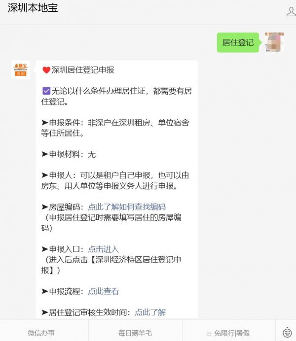 溫馨提示:微信搜索公眾號【深圳本地寶】,關(guān)注后在對話框回復(fù)【居住登記】獲取深圳居住登記辦理入口及流程指引、信息單下載流程、房屋編碼及網(wǎng)格員電話查詢、登記多久可以辦居住證、換房子會(huì)中斷嗎、可以補(bǔ)登記嗎等相關(guān)內(nèi)容