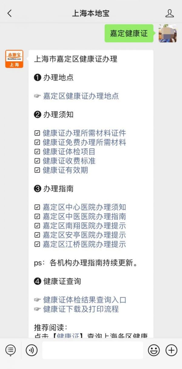 溫馨提示:微信搜索【上海本地寶】公眾號,關注后在對話框回復【嘉定健康證】獲取上海嘉定區(qū)健康證辦理地點及時間、體檢項目、辦理費用、免費辦理所需材料、醫(yī)院健康證辦理指南,健康證查詢入口/下載打印流程等。