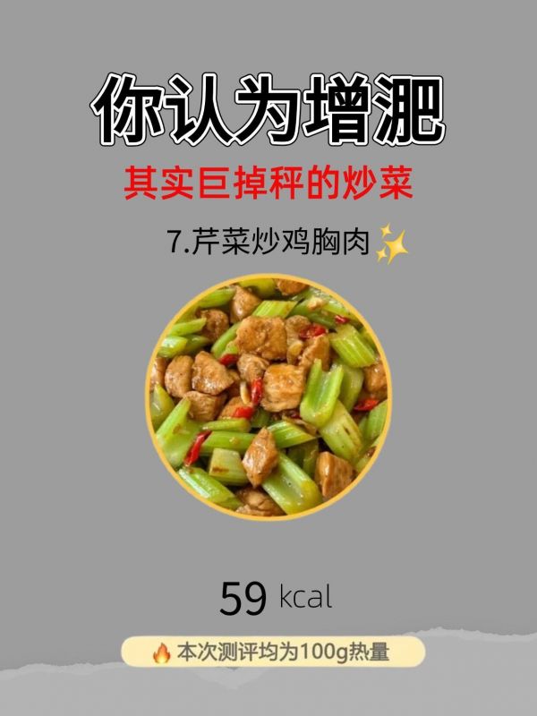 59kcal/100g的芹菜炒雞胸肉,脆嫩鮮爽。芹菜的脆嫩與雞胸肉的鮮嫩結(jié)合,清爽可口。芹菜富含膳食纖維,能促進(jìn)消化;雞胸肉高蛋白助力減脂。這道菜作為減脂期的常菜,讓我們?cè)谙硎艽嗄埘r爽口感的同時(shí),輕松控制熱量攝入,穩(wěn)步邁向理想身材 。芹菜炒雞胸肉的每一次上桌,都是減脂期美味與健康的雙重呈現(xiàn),吃著它,瘦得更安心。