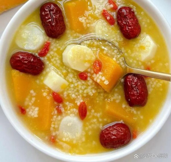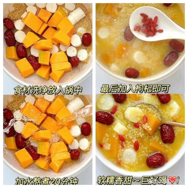 準(zhǔn)備食材:南瓜、山藥、紅棗、小米、枸杞