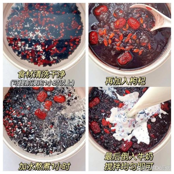 準(zhǔn)備食材:黑豆、枸杞、黑米、紅豆、糯米、紅棗、黑芝麻