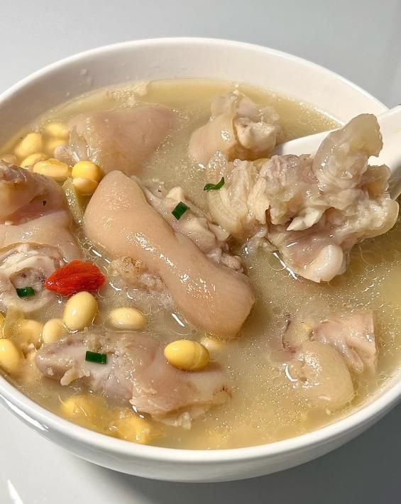 做法:豬蹄處理干凈切塊,黃豆提前泡發(fā)。豬蹄焯水后放入鍋中,加黃豆、姜片、蔥段,加水大火燒開(kāi)轉(zhuǎn)小火燉 2 - 3 小時(shí),加鹽調(diào)味。