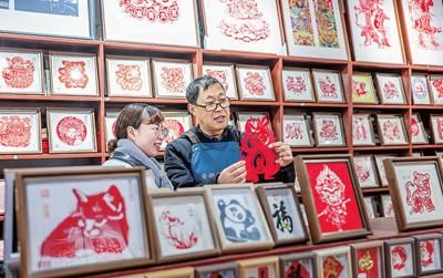 安徽淮北市濉溪縣古城,剪紙非遺代表性傳承人在介紹剪紙技藝。王 文攝(人民視覺)