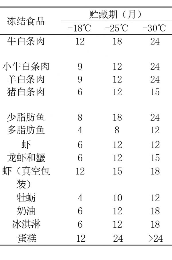 圖為國(guó)際制冷學(xué)會(huì)推薦的各種凍結(jié)食品在不同冷凍溫度下的貯藏期。