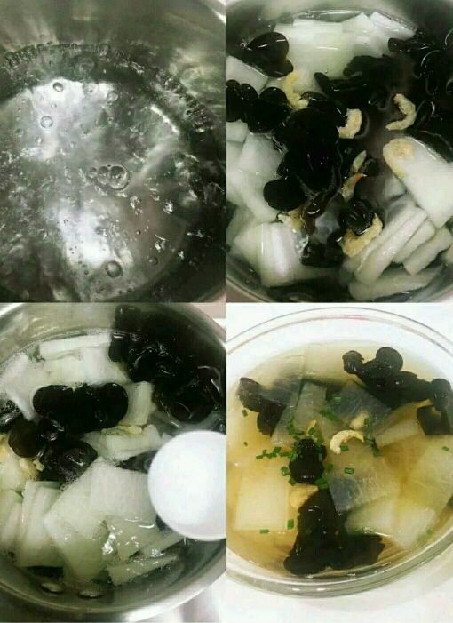 冬瓜去皮,切塊,木耳冷水泡發(fā),鍋里燒開水,倒入冬瓜, 木耳,小蝦米,加一點點鹽,生抽,煮10分鐘,加蔥花