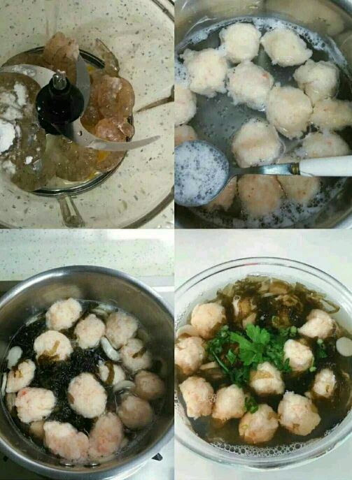蝦去殼去蝦線,加鹽,淀粉,蛋清,倒入攪拌機15秒打沫,擠成丸子煮5分鐘,加入杏鮑菇片,紫菜再煮5分鐘,加蔥花