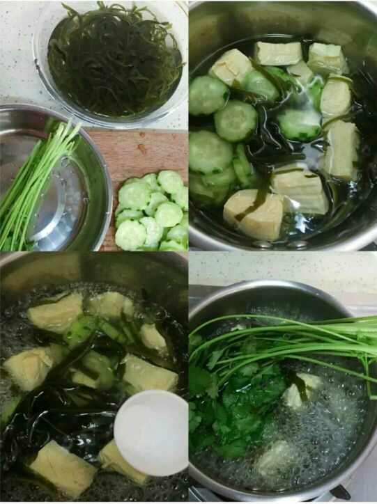 香菜洗凈,黃瓜切片,豆腐切塊,海帶泡發(fā),燒開水后放入豆腐,再放黃瓜,海帶煮5分鐘,加鹽,白胡椒粉,最后放一把香菜