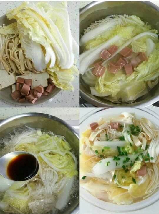 豆腐切塊,火腿腸切丁,金針菇洗凈去根部,豆腐皮切絲,娃娃菜切段,水燒開后放入材料煮10分鐘,加鹽,生抽,胡椒粉,撒蔥花
