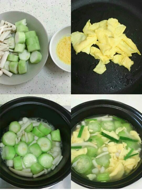 雞蛋打散,海鮮菇,絲瓜切段,橄欖油炒散大塊雞蛋,再起鍋海鮮菇和絲瓜炒軟,加一碗水煮開,倒入之前的雞蛋,加鹽,滴香油,撒蔥花