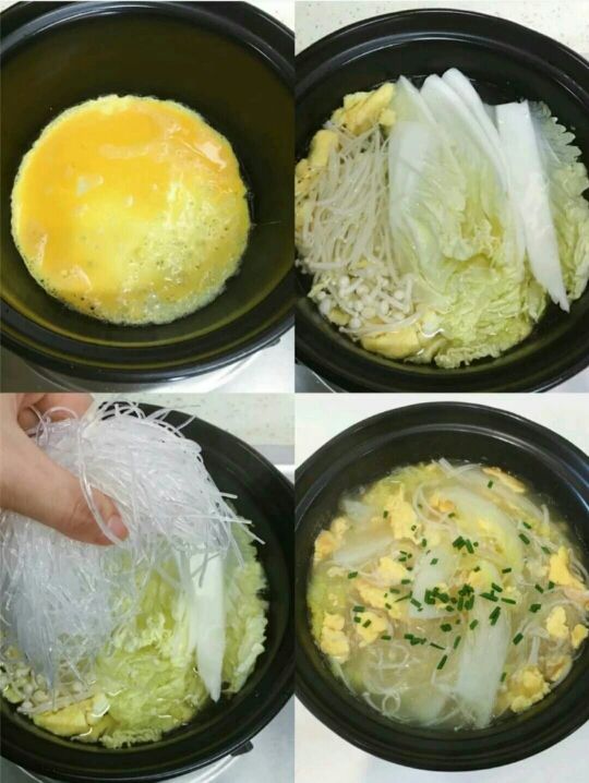 橄欖油炒雞蛋,加適量水放入娃娃菜,金針菇,一點點鹽,放粉絲,小蝦米,胡椒粉煮5分鐘,撒蔥花